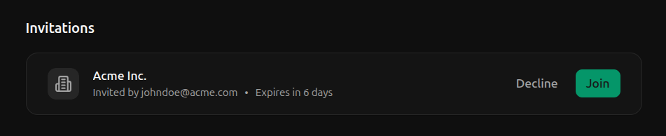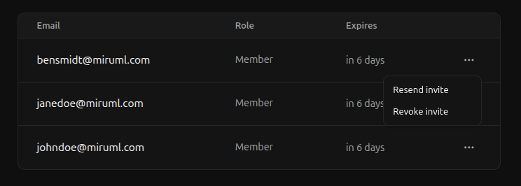 Resending an invite sends a new email to the invitee but does not affect the invite in any way — previous emails remain valid, and the invite’s expiration date is unchanged. Since resending an invite does not extend its expiration date, invitees must still accept it within seven days of its original creation. To give the invitee more time to accept, create a new invite. To resend an invite, navigate to the pending invites tab in the members page. Click the ellipses (…) of the invite to resend and hit Resend Invite.