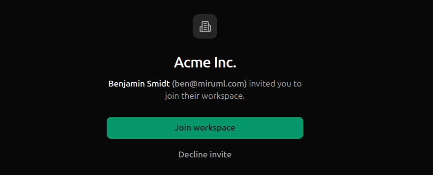 This section covers invites received by users who already have a Miru account. If you do not yet have a Miru account, follow the instructions sent in the invitation email to join a workspace.Accept an invite