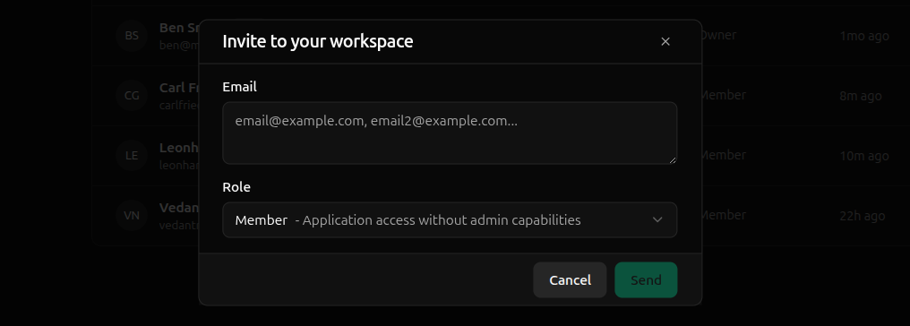 To invite a member to your workspace, navigate to the members page and click Invite in the top right corner. Next, supply the email addresses of the members you want to invite as a comma-separated list, select their , and hit Send.