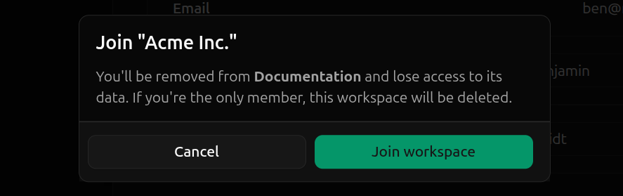 Since user accounts can only belong to a single workspace, accepting an invite from another workspace transfers you from your current workspace to the workspace you’ve been invited to:- You will lose all access to your current workspace