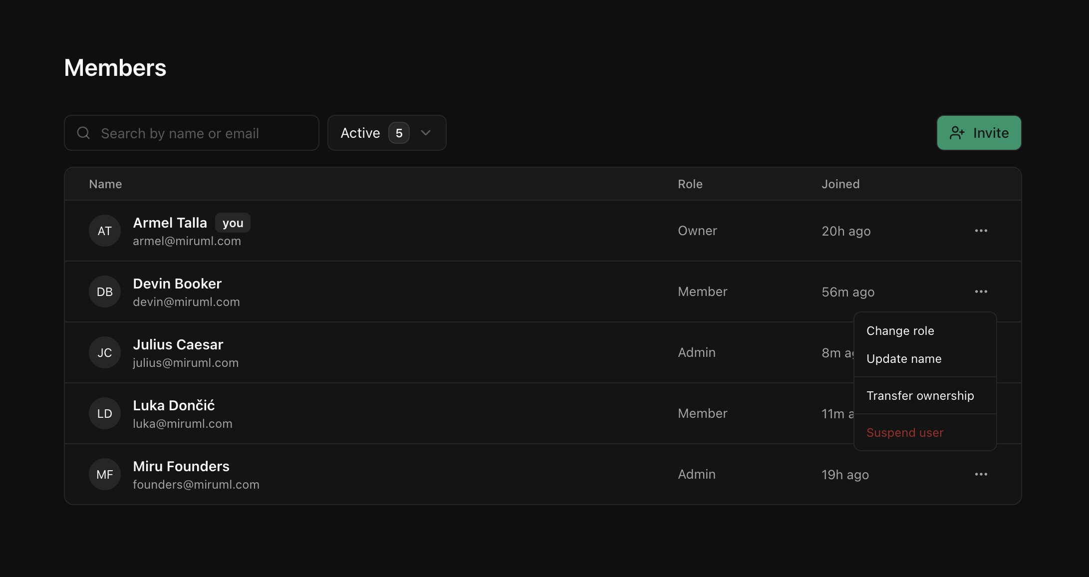 You can now invite team members to your workspace and manage their roles. This release also adds new workspace and profile settings.Inviting team members