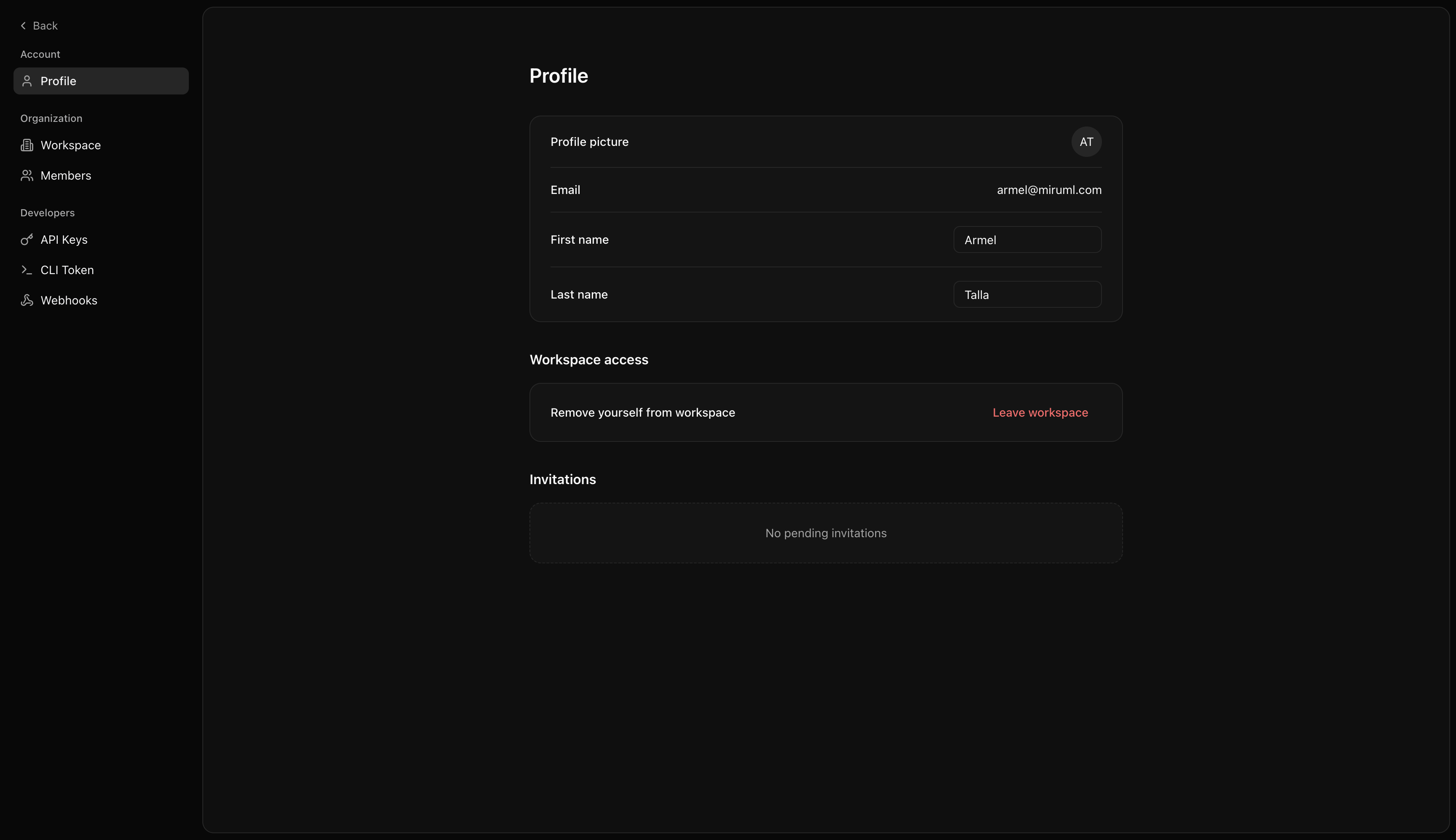Manage your profile and workspace details from dedicated settings pages.- Profile — Update your name, view pending invites, or leave your workspace.