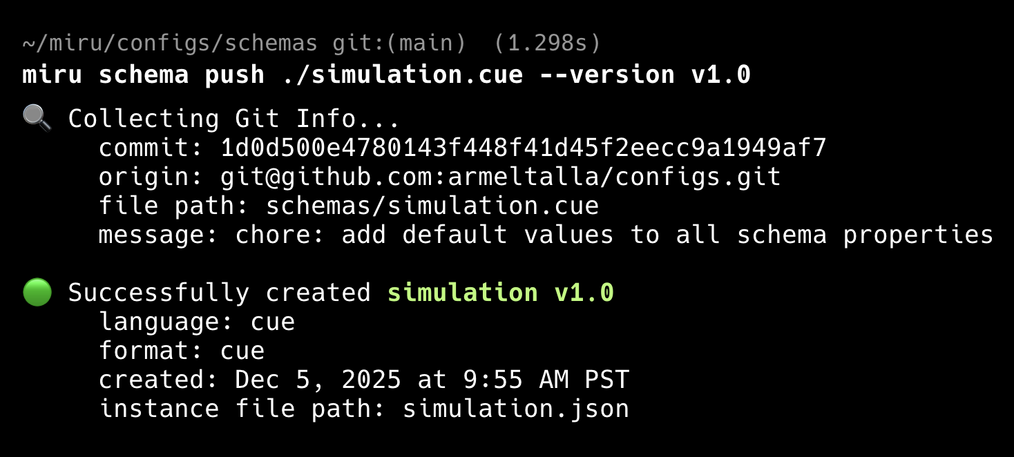 We are excited to announce full support for CUE (Configure, Unify, Execute) as a first-class schema language in Miru. You can now define config schemas in CUE, version them in Git, and push them via the Miru CLI to validate config instances before deployment.Uploading a CUE schema