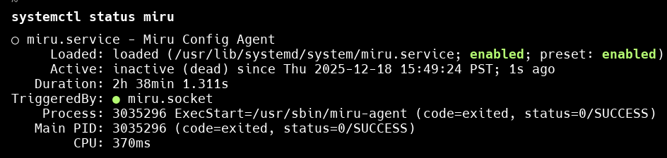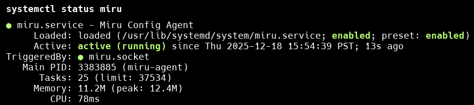 The Miru Agent runs as asystemd service named miru, allowing you to manage the service using standard systemctl commands.