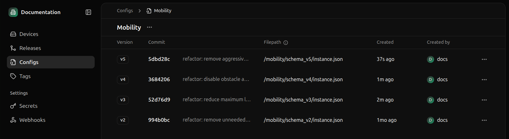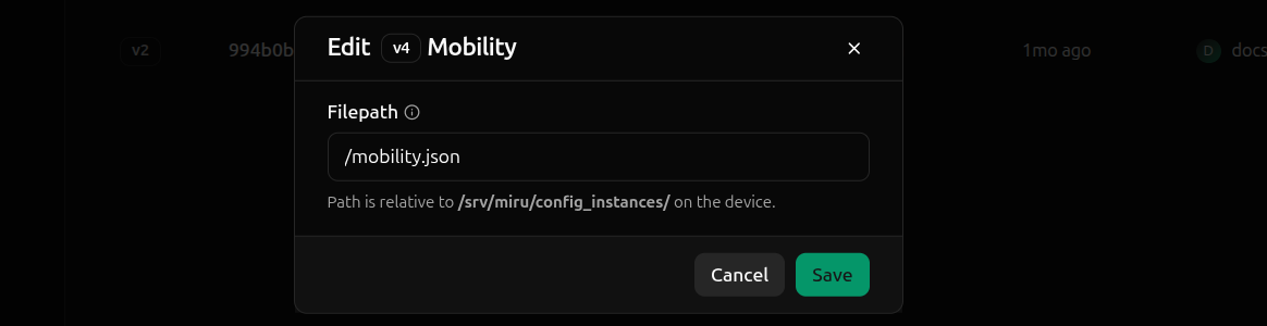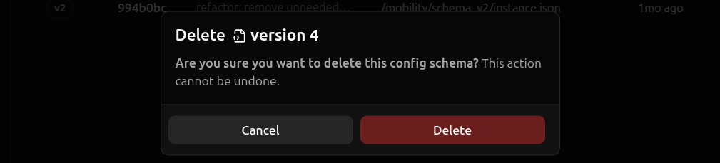 Most config schema properties are immutable. However, some properties, such as the instance_filepath, may be updated after schema creation.Editing the instance_filepath property does not affect existing config instances, including those which have been staged for a future deployment.However, any config instances created after the instance_filepath property is updated will be deployed to the file path specified in the updated instance_filepath property.For a full reference of editable properties, look for the mutable badge in the properties section of the schema overview.To edit a schema, click on the ellipses (…) of the schema you want to edit and click Edit.