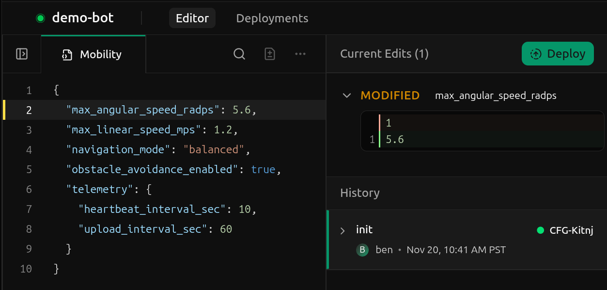 max_angular_speed_radps field to use the maximum allowed value of 3.0 and deploy the config instance to the device.