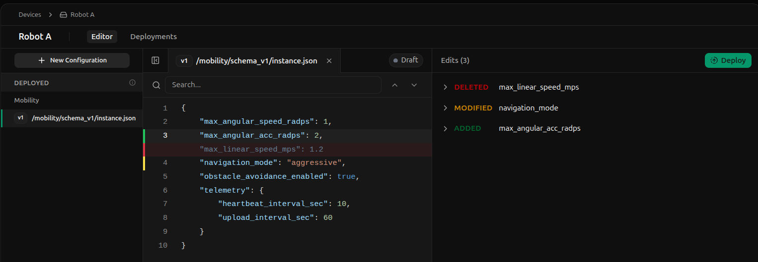 To edit a config instance, simply start making changes from a current config instance. As edits are made, a log on the right maintains a list of all changes, categorizing them by their type (e.g.added