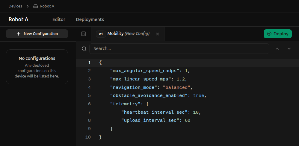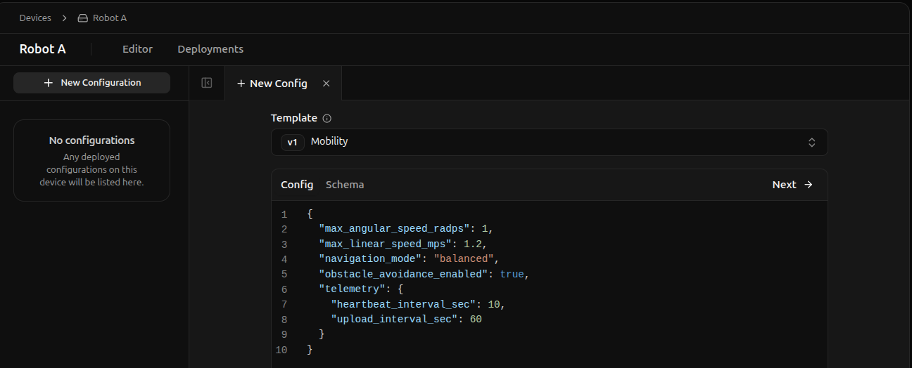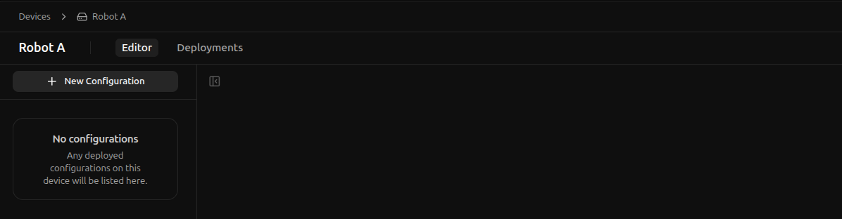 Navigate to the Devices page and click the device you want to deploy a config instance to. Click the New Configuration button in the top left.