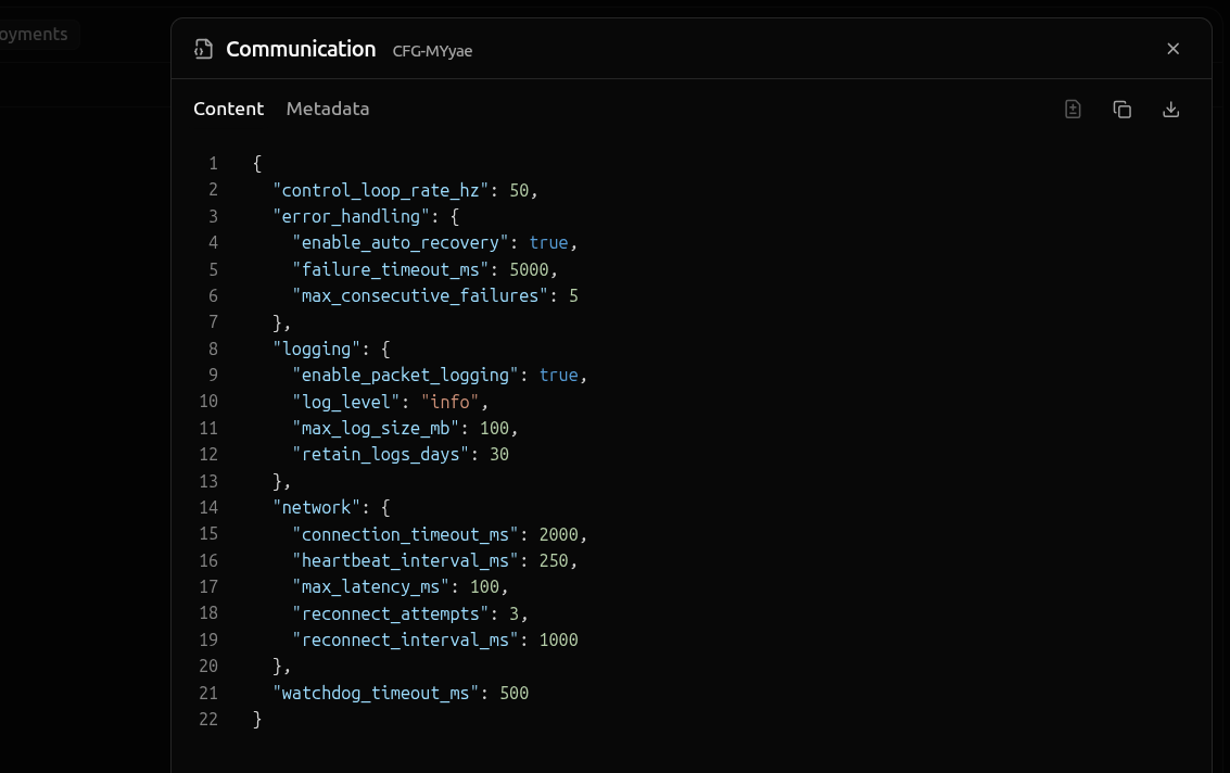 staged, needs_review, queued, deployed, removing, archived, failed, retryingThe configuration values that are deployed to the device in the format of a JSON object.