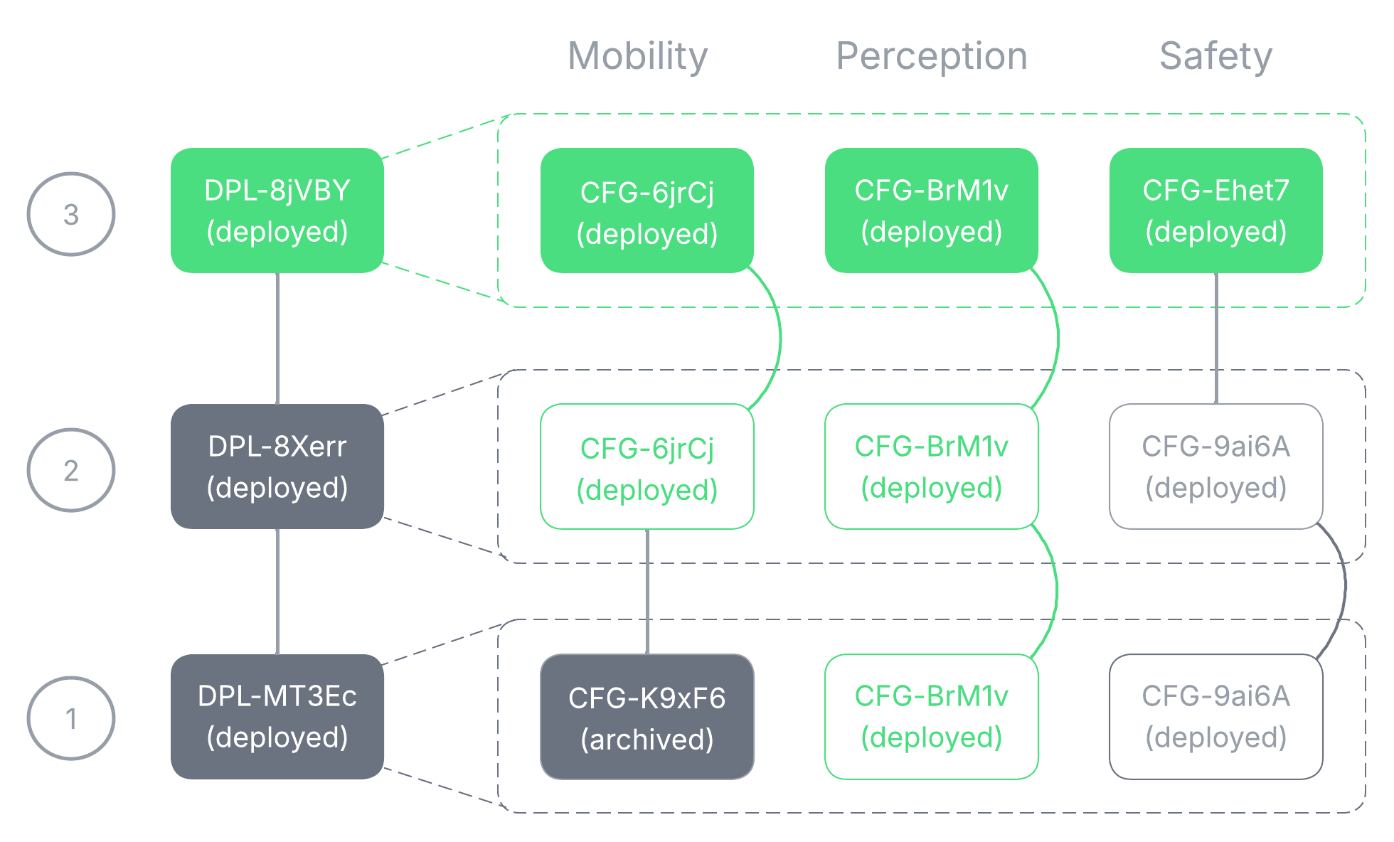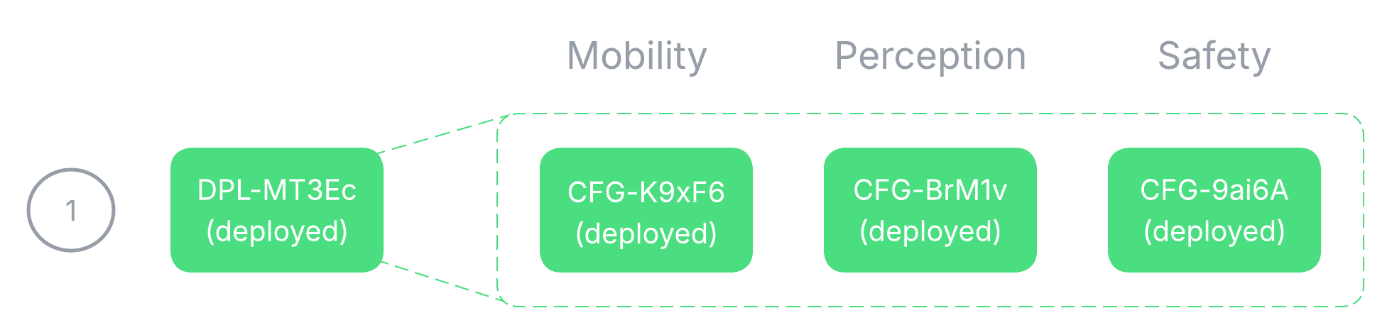 We create an initial deployment, DPL-MT3Ec. The deployment contains config instances CFG-K9xF6, CFG-BrM1v, and CFG-9ai6A which are instantiations of Mobility, Perception, and Safety respectively.