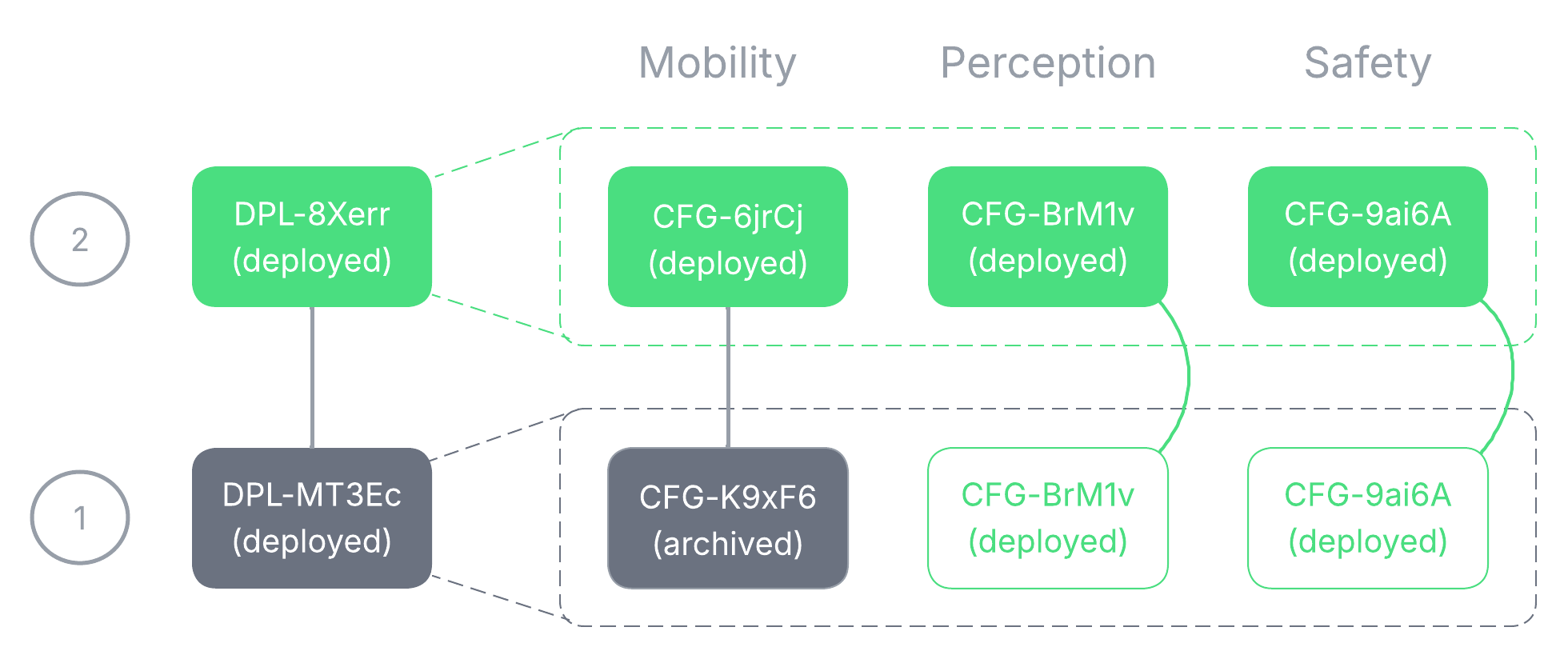 Since no edits were made to the Mobility or Perception instances, DPL-8jVBY reuses the config instances from DPL-8Xerr for those config types. The total number of config instances thus increases from four to five.