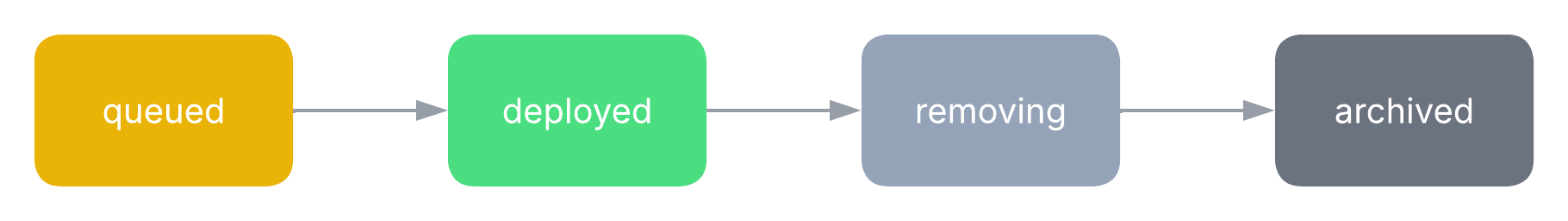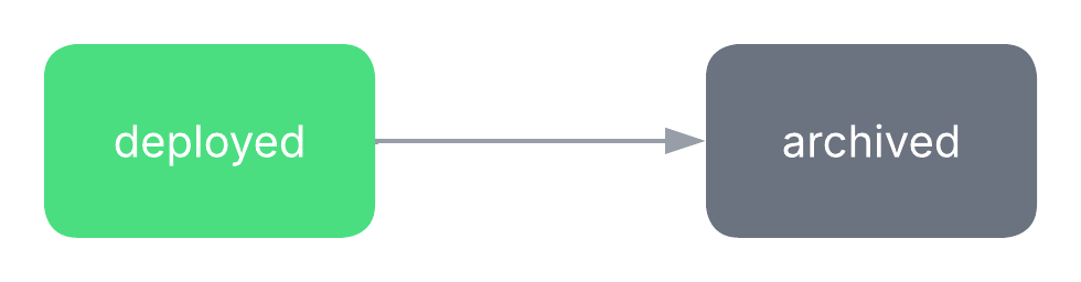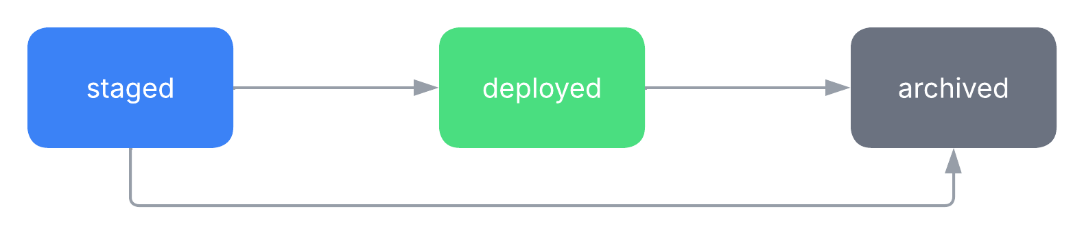 With StagingIf a deployment is staged before being deployed, the diagram below shows the valid transitions between target statuses.Without StagingOf course, many deployments skip staging and deploy immediately (such as those deployed from a device’s config editor). The diagram below shows the valid transitions between target statuses for a deployment that is immediately deployed.One-Time UseAs you can see, the target status can only move forward, never backwards.Once a deployment’s target status has been set to deployed, it can never be set to staged again. Similarly, once a deployment’s target status has been set to archived, it can never be set to deployed again.This is intentional—deployments are one-time use. Once a deployment has been deployed, it cannot be redeployed. You must create a new deployment with identical content to roll back.