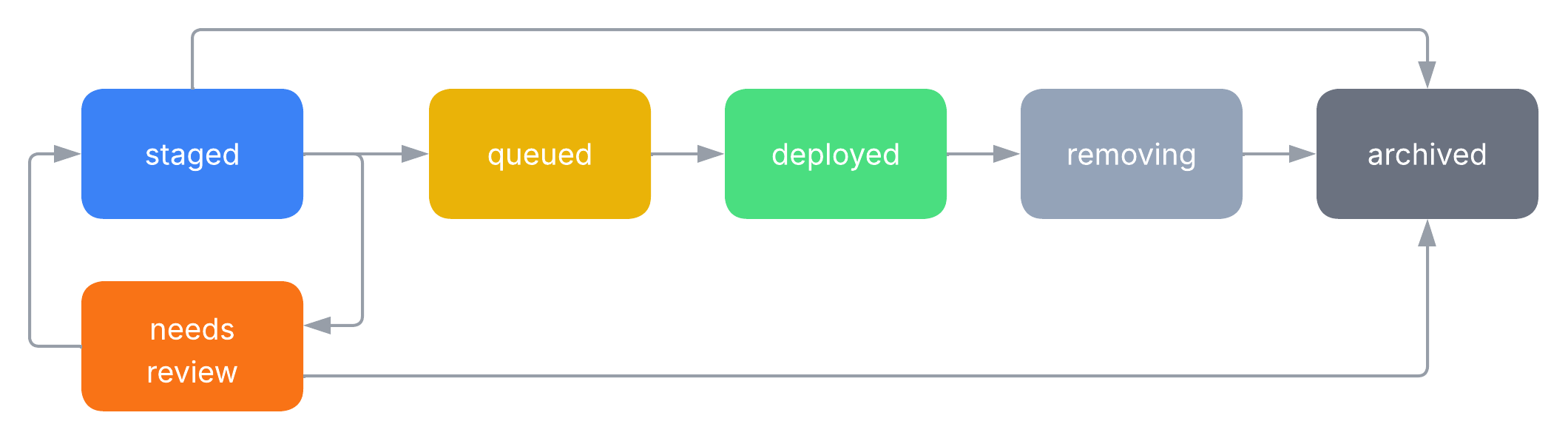 With StagingWhen a deployment is staged before being deployed, it can pass through all the listed activity states. Below is a diagram of the valid transitions between activity states.Deployments start in the staged state. If a deployment drifts, it transitions to needs review and must either be restaged or archived.Eventually, the deployment is queued for delivery to the device, where it passes through the primary deployment lifecycle from queued to archived.Without StagingDeployments which are immediately deployed and skip the staged state have a simpler lifecycle. They simply go through the primary deployment lifecycle from queued to archived.One-Time UseAs with the target status, activity states can only progress forward since deployments are one-time.