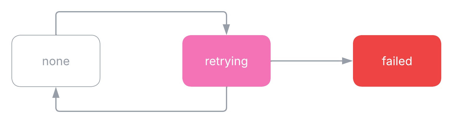 Below are the valid transitions between error states.Deployments start in the none error state. If no errors are encountered, the deployment remains in the none error state for the duration of its existence.Non-Fatal ErrorsIf a non-fatal error is encountered, the deployment transitions to the retrying error state. Non-fatal errors include unexpected network drops, sudden power cycles, and similar events.If the agent recovers the deployment from the error, the deployment transitions back to the none error state once the deployment’s target status is reached.On the other hand, as long as the agent is unable to recover the deployment, the deployment remains in the retrying error state. The agent continually attempts to reach the deployment’s target status, using exponential backoff to prevent resource throttling.If the deployment is stuck in the retrying error state, try replacing or archiving the deployment to allow the agent to start fresh.Fatal ErrorsIf a fatal error is encountered, the deployment transitions to the failed error state, is removed from the device, and marked as archived.