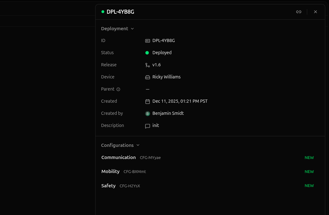 A deployment is a set of config instances delivered to a device for consumption by your software.Deployments tie together config instances, releases, and devices to simplify configuration management and delivery.Deployments have a variety of constraints designed to simplify configuration updates: