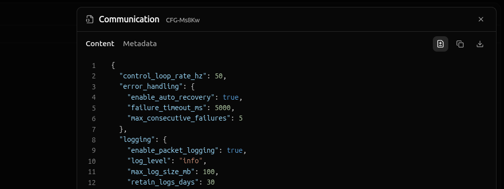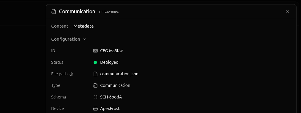 The content tab contains the config instance’s parameters, while the metadata tab contains audit information—the author, creation date, description, etc.