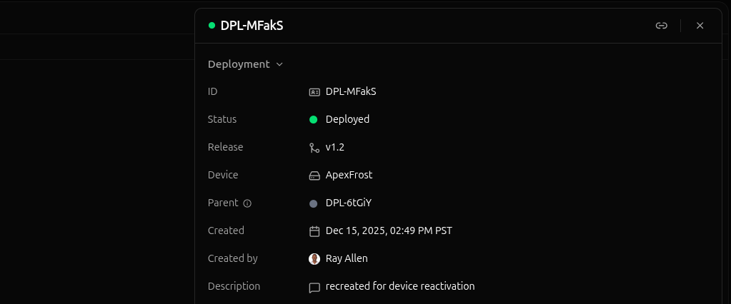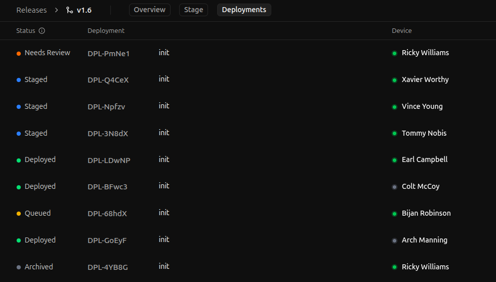 Each release has its own deployment history, accessible by clicking the release on the Releases page and selecting the Deployments tab.Unlike the staging area, the deployment history page lists all deployments for a release: staged, deployed, archived, etc. If a deployment has been created for this release, you can find it in the deployment history page.