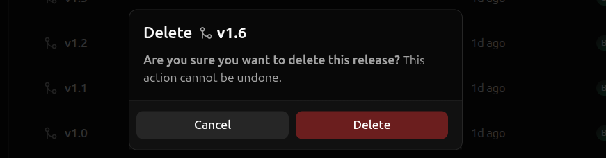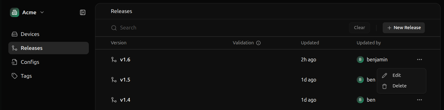 Deleting a release is only possible if no deployments have been delivered to any device with that release. Otherwise, the release cannot be deleted. To delete a release, click the ellipses (…) on the release you want to delete and hit Delete.