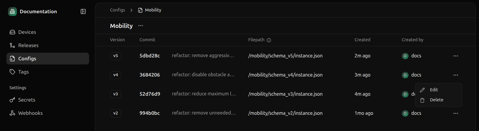Deleting a schema is irreversible. Once a schema is deleted, it cannot be recovered.Deleting a config schema is only possible if there are no config instances for that schema. As such, most schemas cannot be deleted.To delete a config schema, click the ellipses of the config schema you want to delete and select Delete.