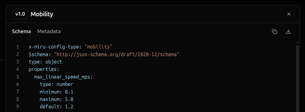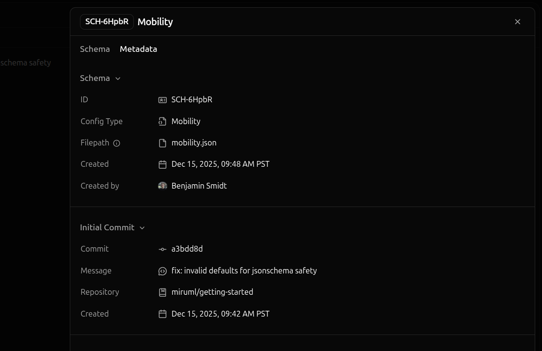 To view a schema in Miru, navigate to the Config Types page and click into the config type that contains the schema you want to view.