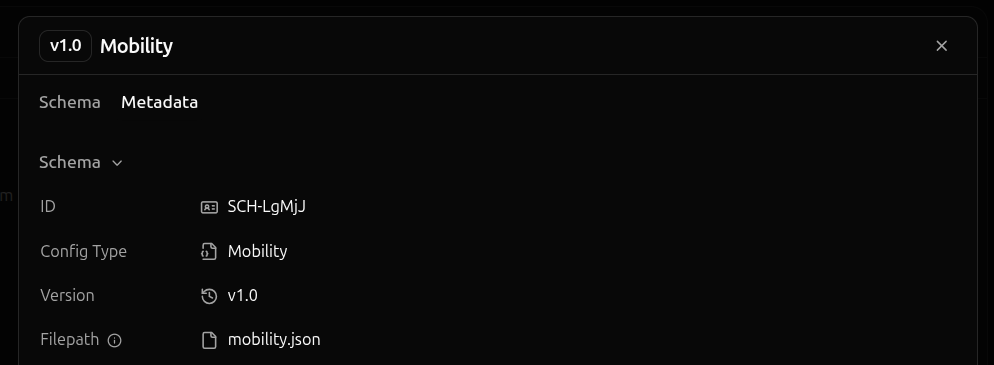 Clicking a schema opens the schema details panel, which displays information about the schema.The Content tab contains the schema’s content, while the Metadata tab contains the schema’s metadata and its Git history.