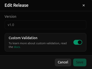 Custom validation is enabled on a per-release basis. Enabling it on one release has no impact on other releases.To enable custom validation for a release, navigate to the Releases page. Click the ellipses on the far right of the release you would like to enable and select Edit from the dropdown.
