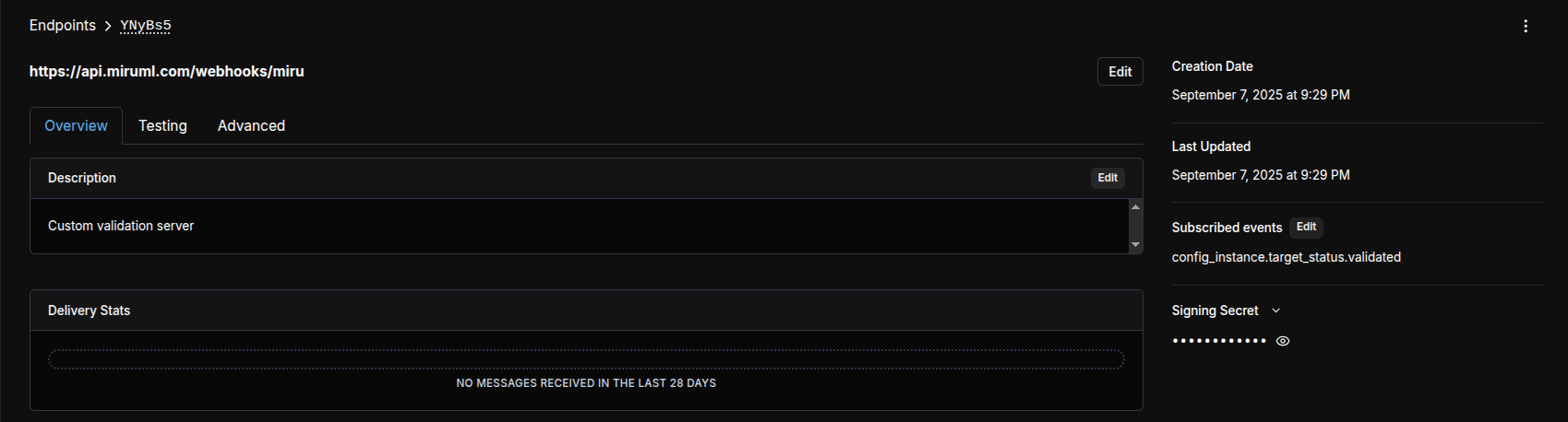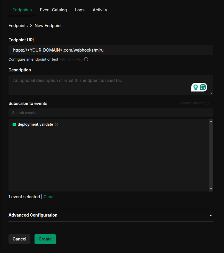 Click Add Endpoint in the top right of the page.Enter the full URL of your validation endpoint and subscribe to the deployment.validate event.We recommend using a route similar to /webhooks/miru, but you may use any route you prefer.URLs should be of the form https://<your-domain>/<route>. For instance, if your domain is my-domain.com and you want to use the route /hooks/miru, your URL would be https://my-domain.com/hooks/miru.
